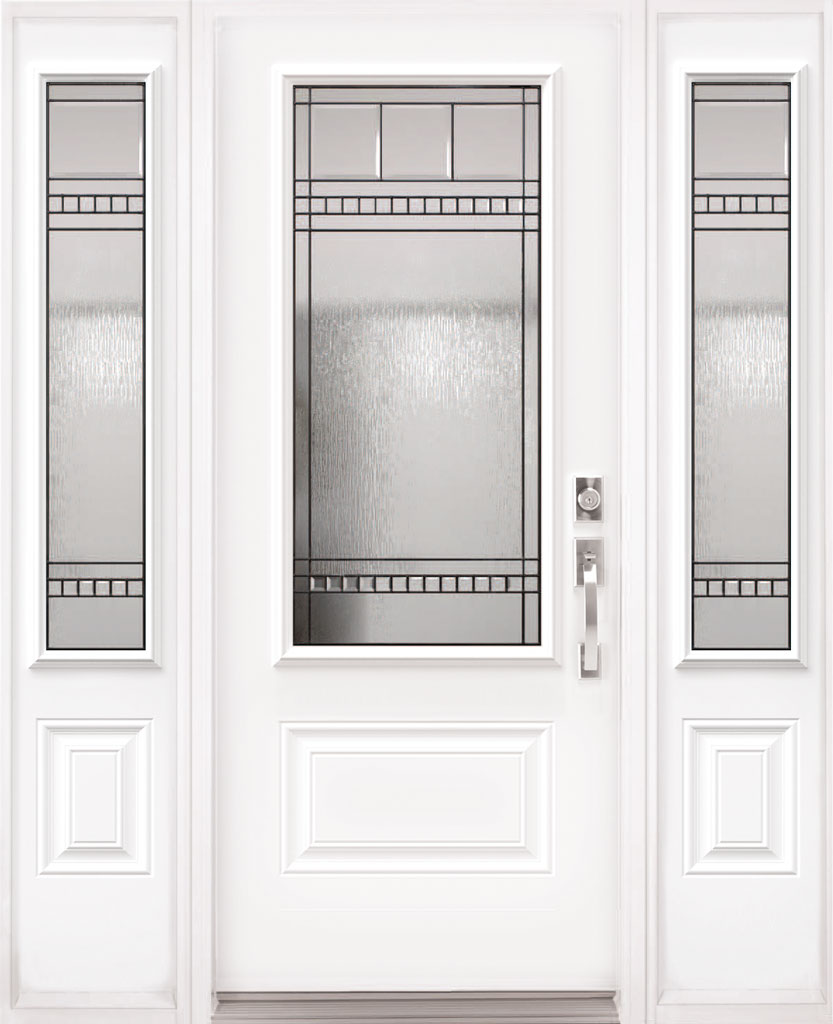 This elegant model complements older styles of architecture beautifully, while also harmonizing perfectly with the clean lines of today. Featuring Chinchilla, Niagara and clear beveled glass with patina caming, it offers a moderate level of privacy.